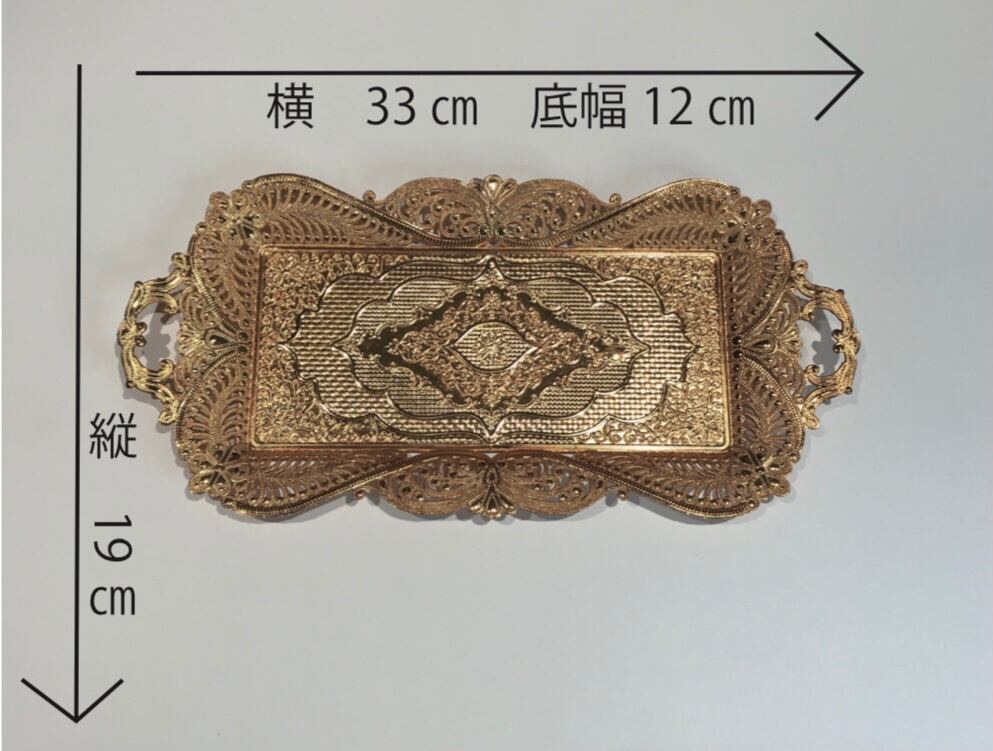 gold tray C...長方形で横幅が狭く、洗練されたデザインが特徴です。万華鏡のようにダイヤ型に広がる美しい模様と、持ち手周りの葉のようなデザインが印象的で、どんなインテリアにも華やかさを添えます。高級感あふれるこのトレイは、特別な場面や日常使いにも最適で、贈り物としても喜ばれる一品です。【製造国】トルコ